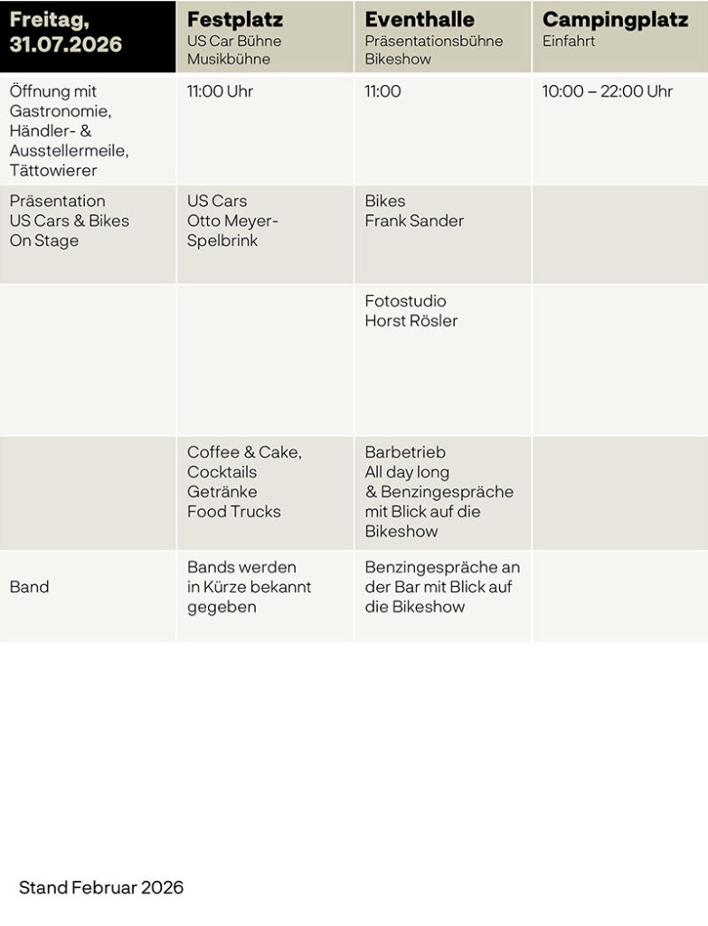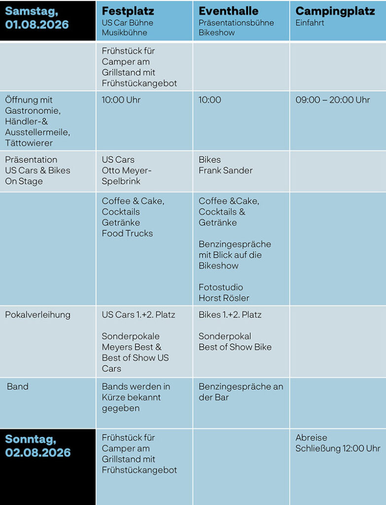 Die Bikeshow befindet sich in der Eventhalle, die Präsentation der US-Cars und die Livemusic neben der Halle. Die ausgestellten US-Cars stehen in einem separaten Bereich des Festgeländes. Die Food Trucks und Händler findet ihr auf dem Festplatz verteilt.